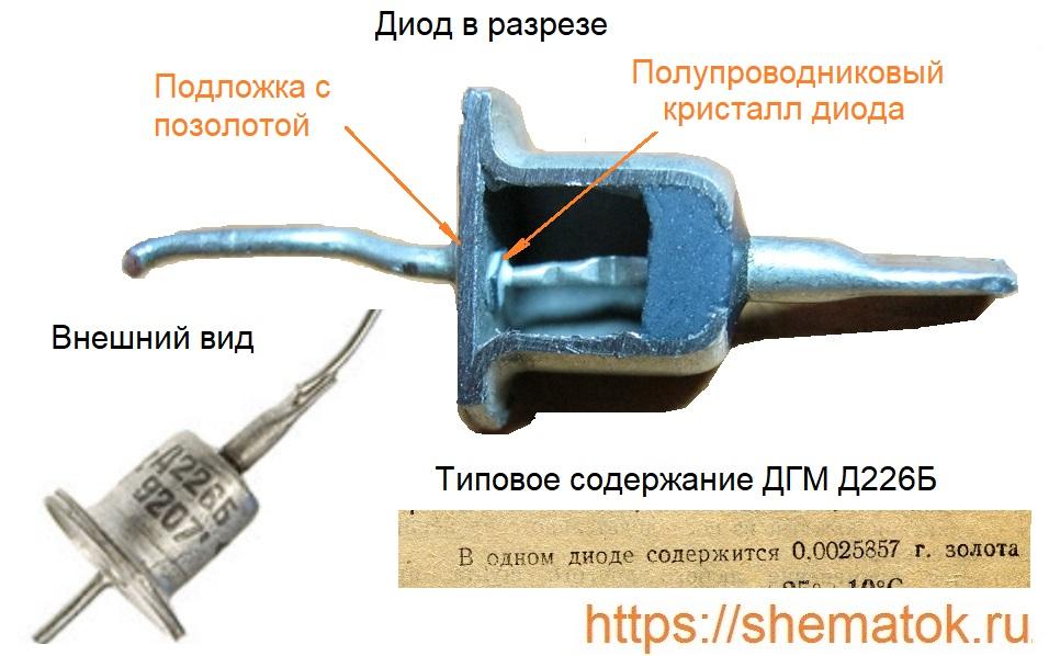 Советские диоды Д226Б за содержание в них драгметаллов (ДГМ) пользуются спросом у скупщиков радиолома. Интерес к ним подогревается спорами, касающимися вопросов нахождения внутри золота и серебра. Многочисленные источники в виде справочников, паспортов на изделие и сопроводительных этикеток не дают полной информации об этом, так как указанные в них данные разнятся.
