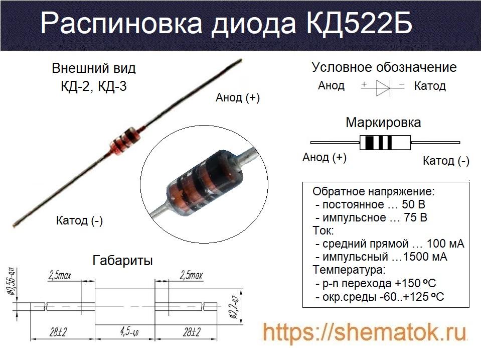 У КД522Б классическая маркировка, которая представляет собой три черных полосы нанесенные производителем на металлостеклянном корпусе (КД-2, КД-3) устройства. Две из них узкие и одна широкая. Последняя расположена рядом с выводом анода (положительный электрод).
