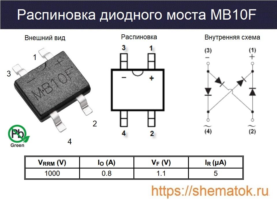 Внешний вид, внутренняя схема и цоколевка (распиновка) MB10F представлены на рисунке. Устройство имеет современный огнестойкий пластиковый корпус (MBF) пассивированный стеклом с четырьмя выводами, удобный для поверхностного монтажа на плату. Соответствует современным экологическим безсвинцовым нормам RoHS.