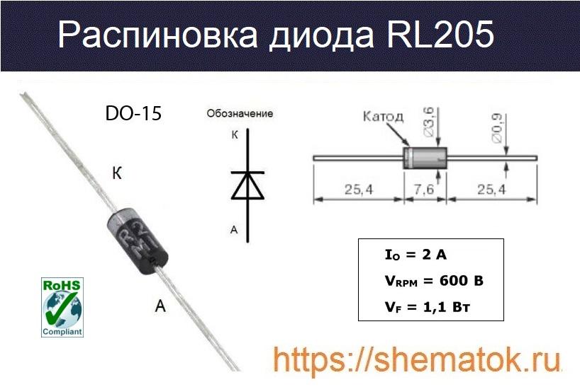 Технические характеристики выпрямительного диода RL205, входящего в линейку однотипных полупроводниковых устройств RL201-207, можно назвать средними. Он используются преимущественно в схемах, где предельно возможный ток не превышает 2 А. Известен, прежде всего, своей высокой стойкостью к перегрузкам и небольшим падением напряжения (до 1 В) в открытом состоянии.