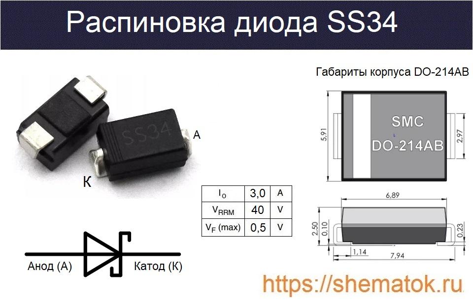 SS34 представляет собой диод Шоттки, имеющий средние технические характеристики в линейке SS32-36. Согласно datasheet он конструктивно выполнен по эпитаксиальной структуре, в SMD-корпусе c встроенным зажимом для автоматического размещения. Обладает очень низким прямым падением напряжения (до 0,5 В), высокой допустимой нагрузкой по току (до 3 А). Применяется в низковольтных, высокочастотных инверторах, импульсных блоках питания и др.