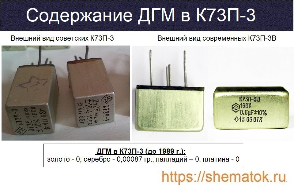 Несмотря на презентабельный внешний вид конденсаторов К73П-3, содержание драгметаллов (ДГМ) в них незначительное. На старых советских этикетках можно найти информацию о небольшом количестве технического серебра (до 0,00087 г). Однако, на упаковках с устройствами выпущенными после 1991 г. указано на полное отсутствие каких-либо ценных металлов.