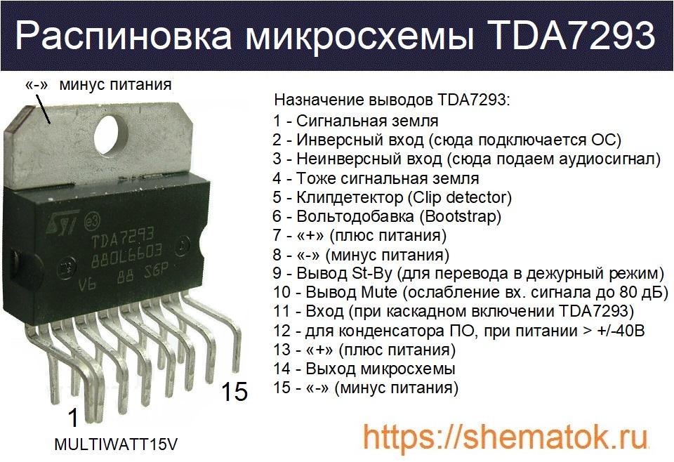 TDA7293 производится в пластиковом корпусе MULTIWATT15, который имеет 15 контактов. Бывает в двух исполнениях: для вертикальной (MULTIWATT15V) или горизонтальной (MULTIWATT15Н) установки на плату. Подложка имеет физическое соединение с восьмой ножкой (минусом). Назначение каждого из выводов микросхемы приведено на рисунке ниже.
