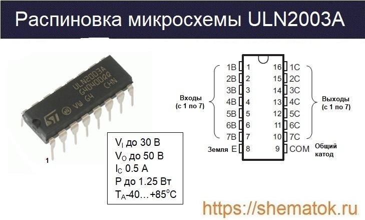 Согласно техническим характеристикам, ULN2003A представляет собой микросхему, в состав которой входит семь мощных биполярных составных NPN-транзисторов Дарлингтона, соединённых по схеме с общим эмиттером. Каждый из них способен выдерживать до 50 В, ток до 0.5 А, c максимальной мощностью до 5 Вт. Встроенные защитные диоды на выходе предотвращают от возможных всплесков обратного напряжения в индуктивной нагрузке и других негативных факторов.