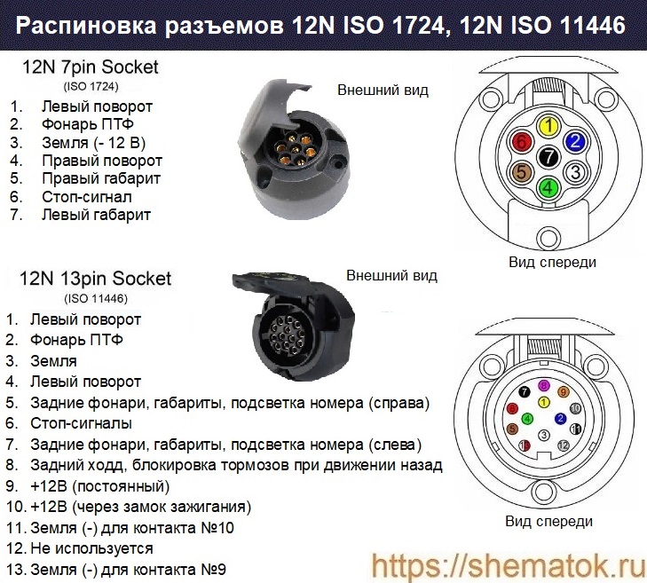 В настоящее время в мире существует множество разнообразных вариантов распиновки разъёма для прицепа легкового автомобиля. В России и ближнем зарубежье они хорошо известны и изготавливаются согласно требований ISO 11446 (13-pin) и ISO 1724 (7-pin). При этом, наиболее широко распространены только последние, у которых семь контактов. Внешний вид (фото) и назначение контактов представлены на рисунке.
