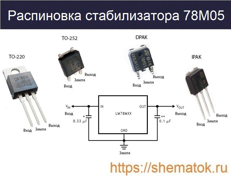 Цоколевка 78M05 и типовая схема включения представлены на рисунке ниже. Независимо от типа корпуса (встречается в ТО-220, ТО-252, D-PAK, I-PAK) микросхема оснащена тремя выводами с назначением: вход (слева), земля (посередине), выход (справа). Большинство современных версий устройства имеют пластиковую упаковку D-PAK.