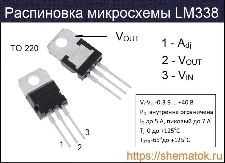 У lm338 всего три вывода, распиновка микросхемы в корпусе ТО-220 (слева на право): для регулировки — 1, напряжение на выходе -2 и подаваемое на вход – 3. Металлическая подложка имеет физическое соединение с контактом – 2. Внешний вид, основные параметры и полная цоколевка показаны на изображении ниже.