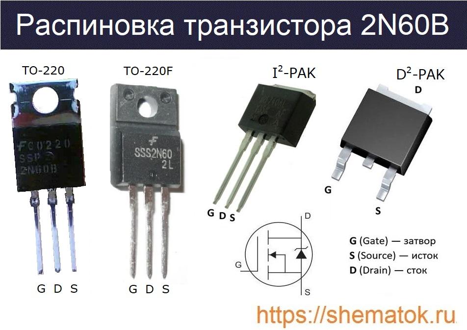 Первоначально 2N60B выпускался в пластиковых упаковках ТО-220 и ТО-220F. В настоящее время изделие производят в корпусах D2-PAK и I2-PAK. Внешний вид и распиновка представлены выше. Расположение выводов у всех (слева на право): затвор (G), исток (D), сток (S).