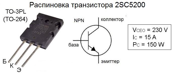 Транзистор 2SC5200 изготавливается в современном пластмассовом корпусе TO-264 (TO-3PL) или 2-21f1a. Оснащён тремя гибкими металлическими выводами для дырочного монтажа на плату. Если смотреть на маркировку устройства, то они будут располагаться следующим образом: слева – база (Б), по центру — коллектор (К), справа — эмиттер (Э).