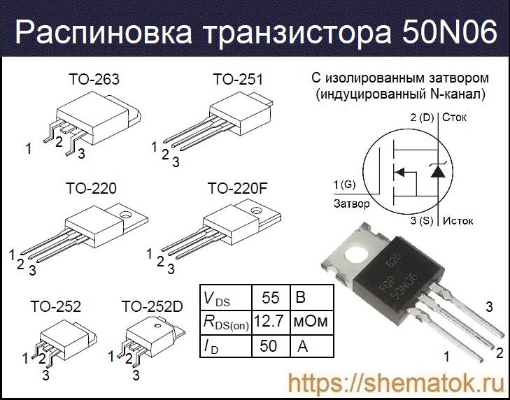 У наиболее распространенного 50N06 в корпусе ТО-220 цоколевка (слева на право): 1 — затвор (З), 2 – сток (С), и 3 – исток (И). Стоит отметить, что в настоящее время существует и другие варианты исполнения устройства, расположение выводов не отличается. На изображении ниже приведены примеры распиновки для различных типов упаковки.