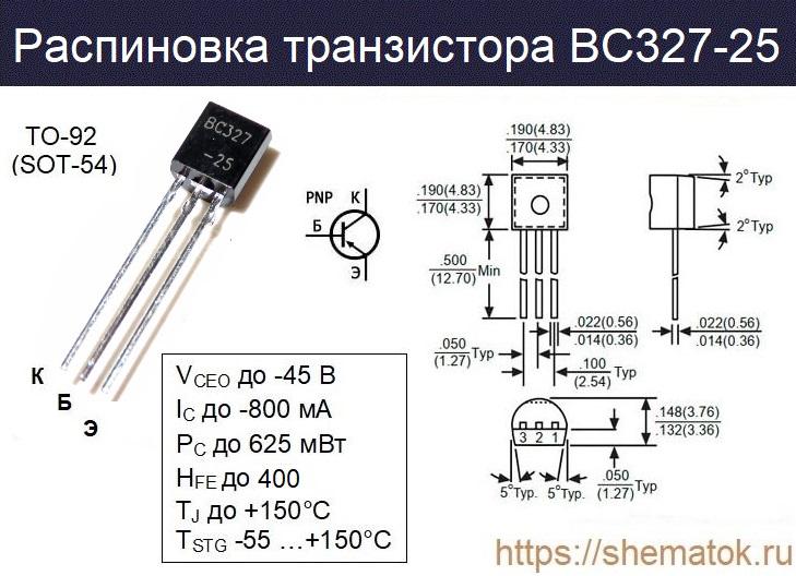 Небольшое по габаритам полупроводниковое устройство BC327-25 представляет собой обычный биполярный транзистор средней мощности, его характеристики способствуют широкому применению в различных схемах усиления звуковой частоты. По своим свойствам занимает место посередине в линейке BC327xx. Предельно возможный коэффициент усиления может достигать 400 HFE, при токе коллектора (IC) 100 мА с напряжением (VCE) до 1 В.