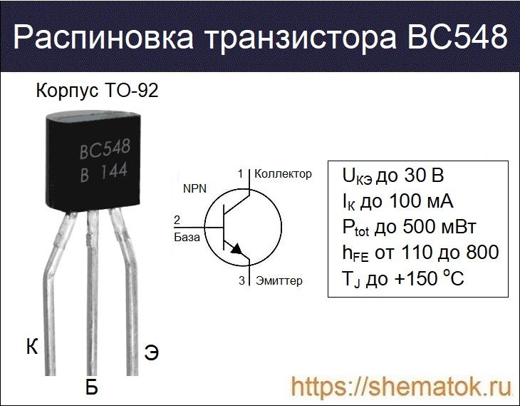Современные (в пластиковых упаковках ТО-92, SOT-54, ТО-226) транзисторы BC548 имеют следующую распиновку (слева на право): коллектор (К), база (Б), эмиттер (Э). Она характерна для всей серии устройств BC54x. Внешний вид, условное обозначение и основные параметры представлены на изображении ниже.