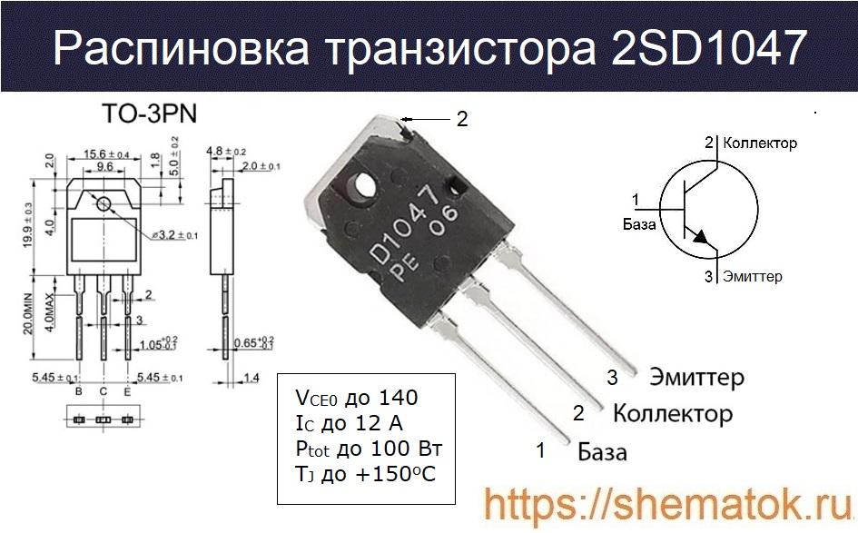 Полное наименование устройства — 2SD1047. Первые два символа «2S» в маркировке не приводятся и указывают на то, что перед нами биполярный транзистор.