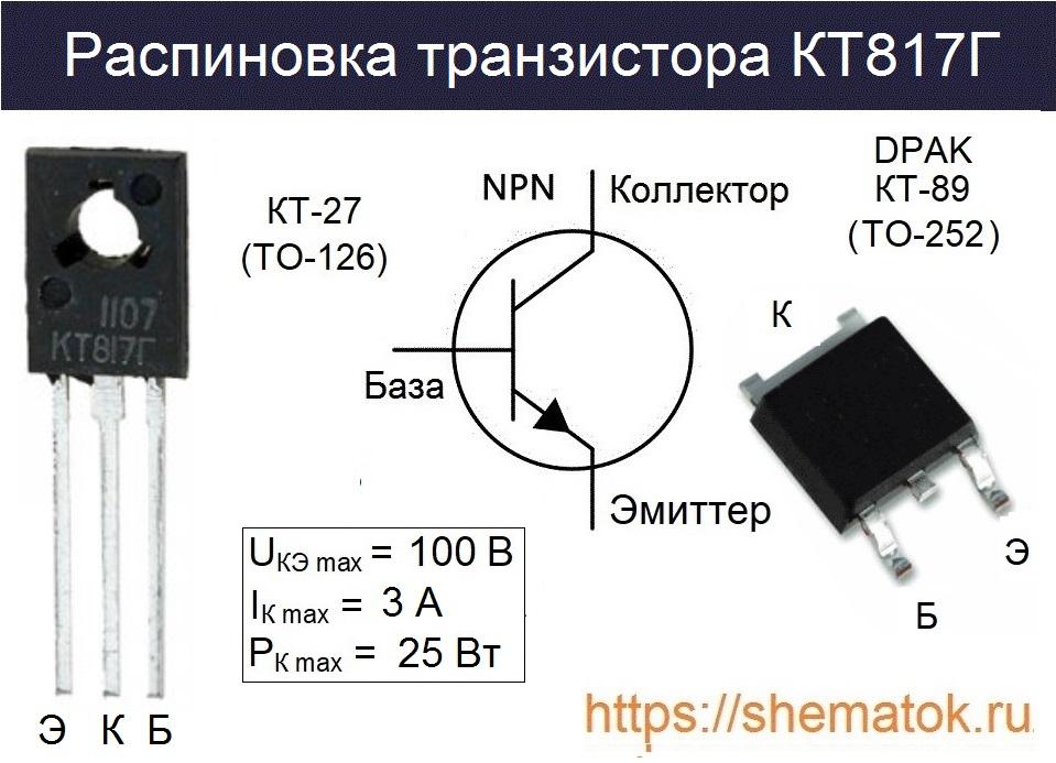 Оба корпуса выполнены из пластмассы. У транзистора КТ817Г (КТ-27), с отверстием для крепления на радиатор, следующее назначение контактов: первая ножка – эмиттер (Э), вторая – коллектор (К), третья – база (Б). Задняя часть металлизированной упаковки в таком исполнении физически соединена с коллекторным выводом.