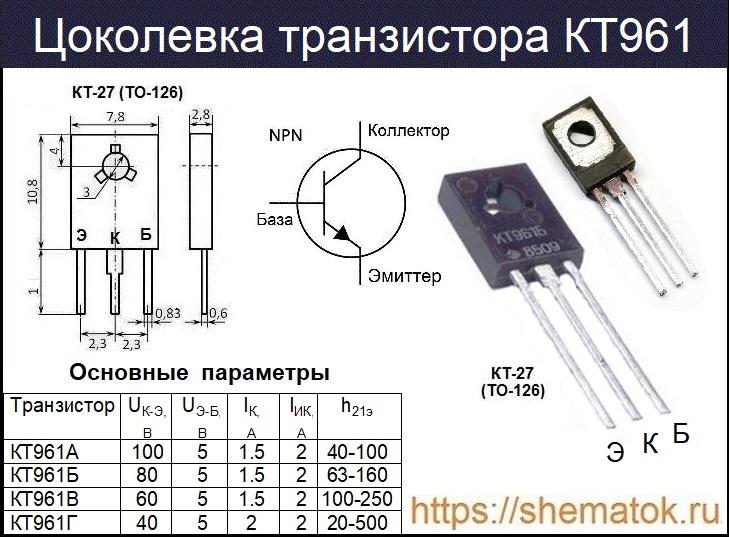 Цоколевка КТ961 у всей серии одинаковая, слева на право (если смотреть на маркировку) расположены выводы: эмиттер (Э), коллектор (К), база (Б). Изделие выполнено в классическом огнеупорном пластиковом корпусе ТО-126 (российский аналог КТ-27), в соответствии с техническими условиями аАО.336.358ТУ/04. Для крепления на радиатор необходимо использовать технологическое отверстие. Внешний вид, подробная распиновка и основные параметры показаны на изображении.