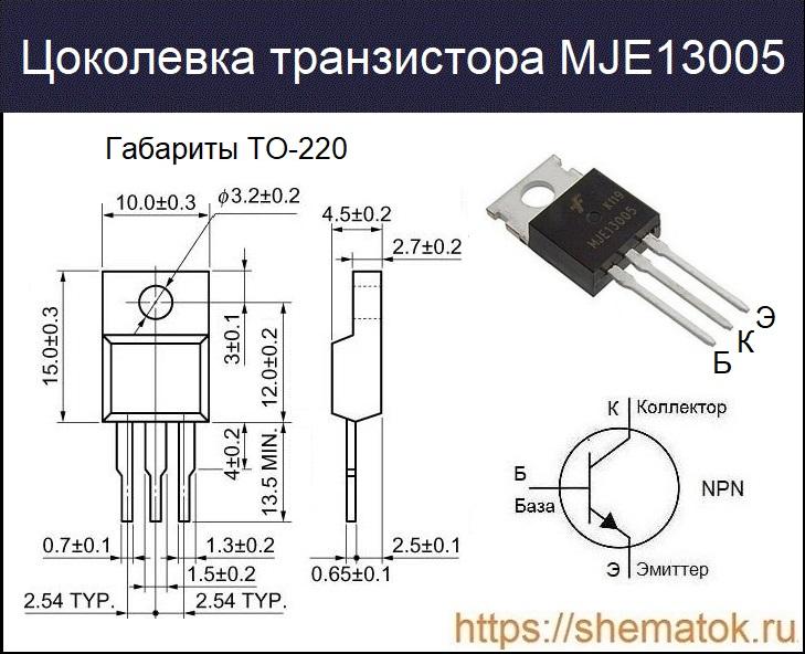MJE13005 выпускается в огнеупорном пластиковом корпусе ТО-220 и его различных модификациях (в зависимости от компании-производителя). Три вывода устройства имеют назначение (слева на право): база (Б), коллектор (К), эмиттер (Э). Вид спереди, габариты и цоколевка 13005 приведены на изображении.